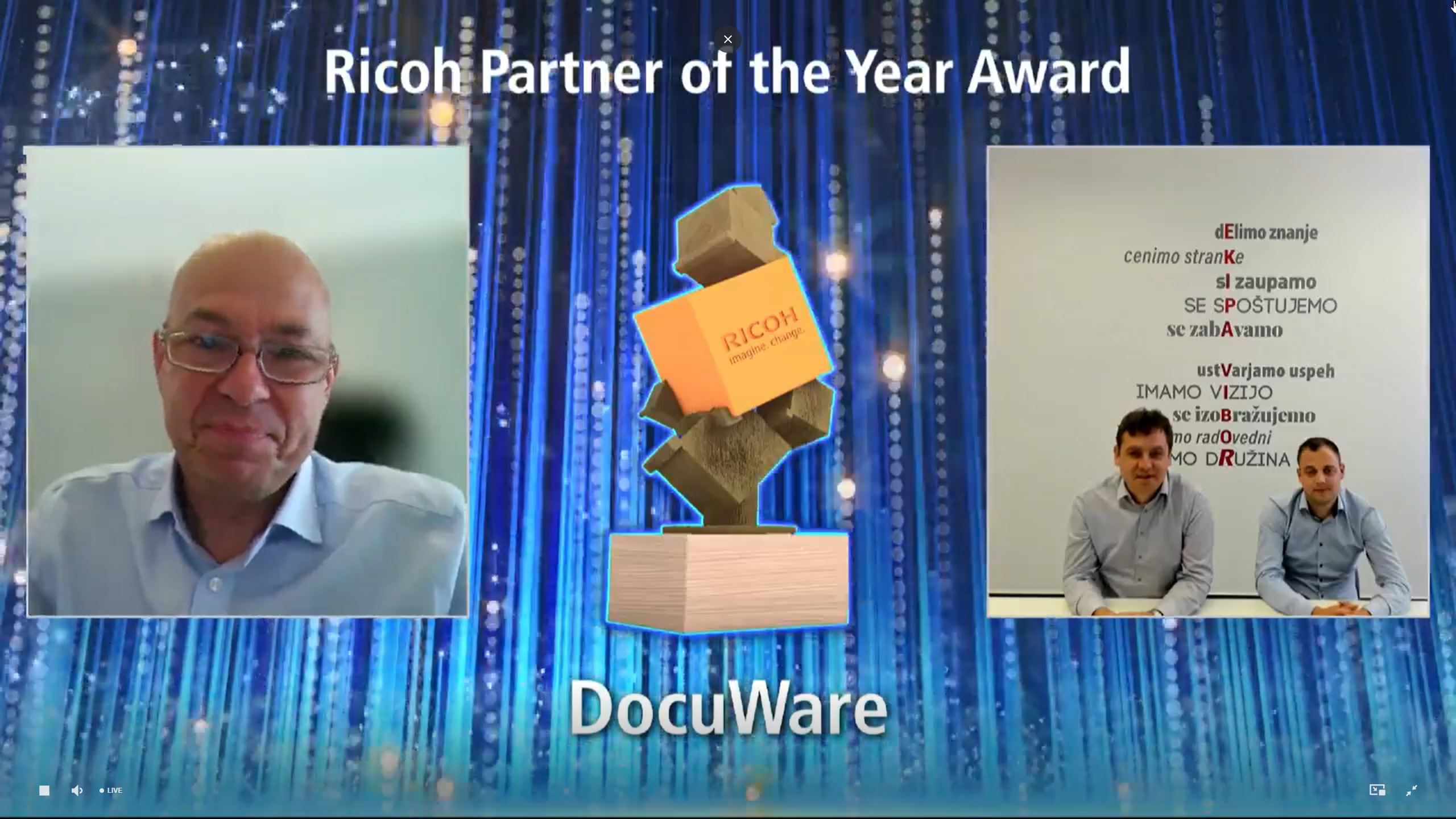 Dolgoletni Viborjev partner Ricoh nas je včeraj nagradil z še eno nagrado v letošnjem letu in sicer smo postali Ricoh Partner leta na področju upravljanja z dokumentni in digitalizacijo poslovnih procesov z dokumentnim sistemom DocuWare. Prepoznali so naše napore, trud in vloženo energijo v vse vas, naše stranke, ki ostajate za nas, na prvem mestu.